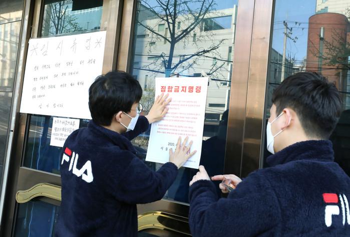 9일 서울 강남구가 코로나19 확산 방지를 위해 지역내 유흥시설 476곳에 집합금지 공문을 전달하고 오는 19일까지 강남·수서 경찰서와 합동단속반을 구성, 행정 명령 이행사항을 점검한다. 구는 이행하지 않는 업소는 경찰서에 고발 조치할 예정이다. 사진은 집합금지 행정명령서를 부착하고 있는 구청 직원들의 모습.(사진제공=강남구청)