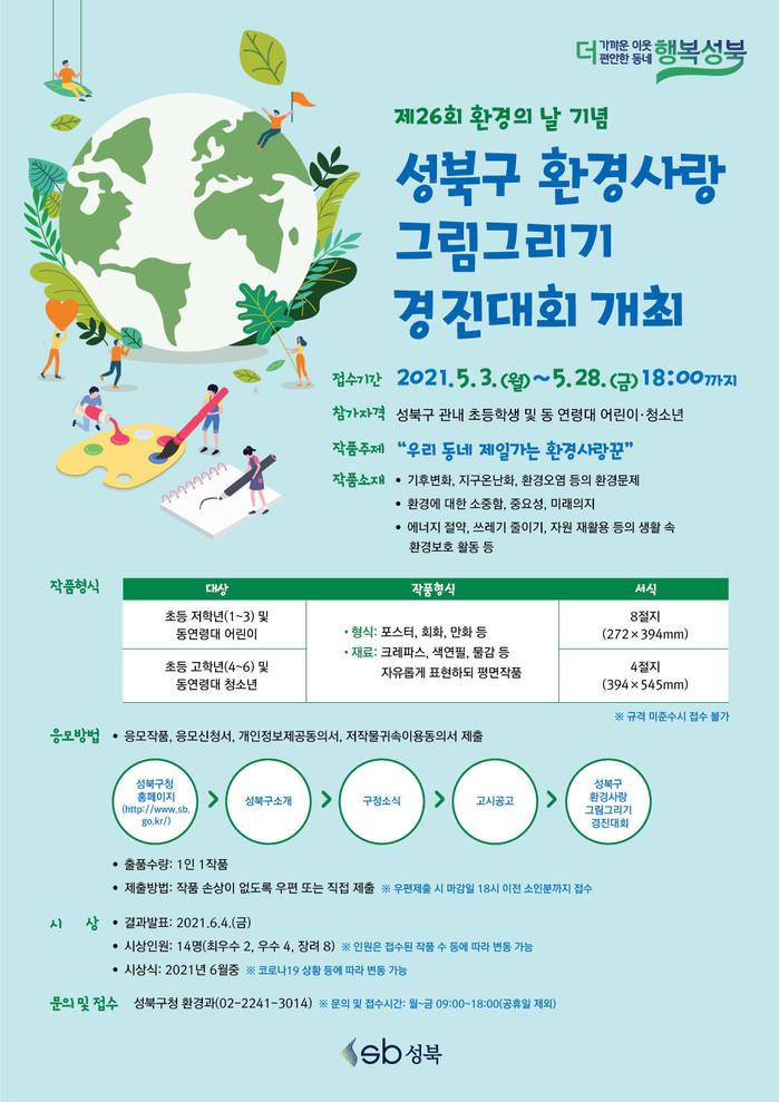 [시민일보 = 홍덕표 기자] 서울 성북구(구청장 이승로)가 제26회 환경의날(6월5일)을 맞아 3일부터 오는 28일까지 어린이·청소년들을 대상으로 '성북구 환경사랑 그림그리기 경진대회'를 비대면으로 개최한다.