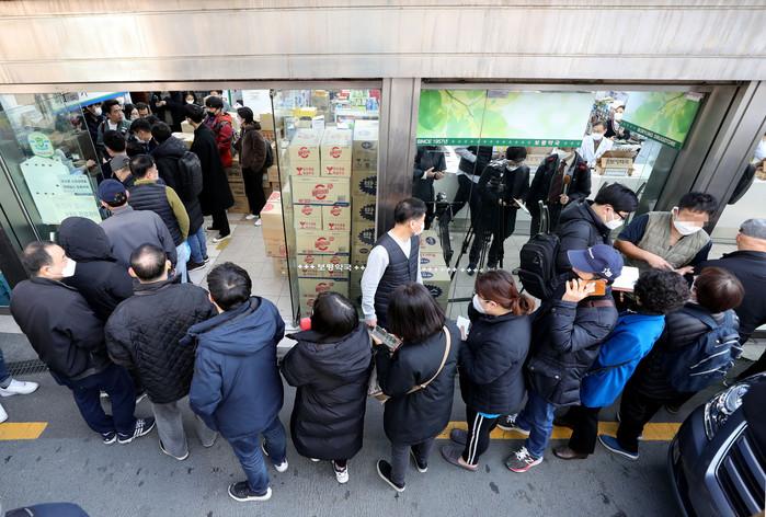공적 마스크 5부제가 시행되는 9일 오전 서울 종로5가 인근 한 약국에서 시민들이 마스크 구매를 위해 줄을 서고 있다. 마스크 5부제에 따라 출생연도 끝자리가 1과 6이면 월요일, 2와 7이면 화요일, 3과 8이면 수요일, 4와 9이면 목요일, 5와 0이면 금요일에 마스크를 살 수 있다.