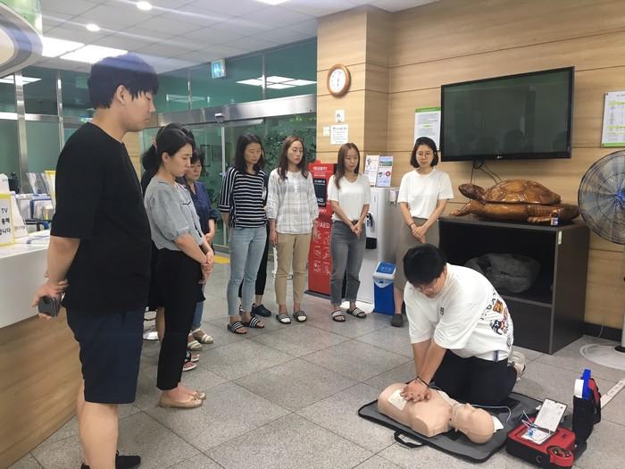 경기 수원시 영통구 원천동 행정복지센터는 지난 16일 동 청사를 방문하는 민원인들에게 위기 상황이 발생했을 때를 대비해 전직원을 대상으로 청사내 설치된 자동심장충격기 사용법에 대한 교육을 실시했다. 사진은 참여자들이 심폐소생술 실습을 하고 있는 모습. (사진제공=영통구청)