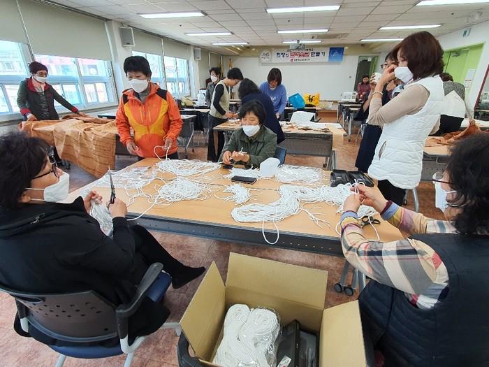 전남 장흥군 종합사회복지관 자원봉사자 60여명이 코로나19 위기 극복을 위해 최근 사흘간 복지관 대회의실에서 면 마스크 1000장을 제작했다. 제작한 마스크는 노인맞춤돌봄서비스 대상자, 생활지원사 등에 전달할 예정이다. 사진은 마스크를 만드는 봉사자들의 모습. (사진제공=장흥군청)