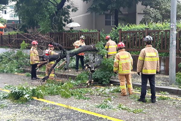 서울 도봉소방서는 최근 태풍 '레끼마'의 영향으로 도봉동 쌍문동의 한 아파트 길가에 가로수가 쓰러지는 사고가 발생해 인근 도로가 정체됨에 따라 긴급출동해 가로수를 절단한 후 안전을 확보했다. 사진은 소방관들이 사고 현장을 정비하는 모습. (사진제공=도봉소방서)