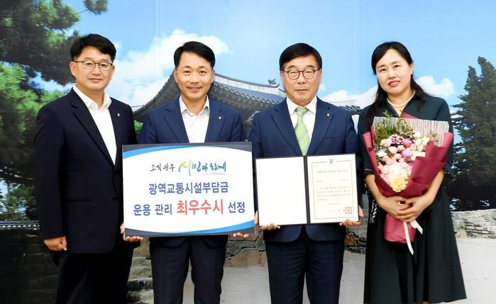경기 광주시는 2일 ‘경기도 광역교통시설부담금 운영 평가’에서 운영 전방에 대해 높은 평가를 받아 최우수상을 수상, 시상금 1000만원을 받았다. 사진은 신동헌 시장(오른쪽 두 번째)과 관계자들이 기념촬영을 하는 모습. (사진제공=광주시청)