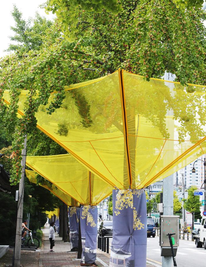 27일 오후 경기 수원시 장안공원 일대 은행나무에 '은행열매 수집망'이 설치돼 있다. 수원시공원녹지사업소는 27일부터 은행 열매 악취로 인한 시민 불편을 해소하고, 쾌적하고 안전한 보행 환경을 조성하기 위해 수거 작업을 실시한다.