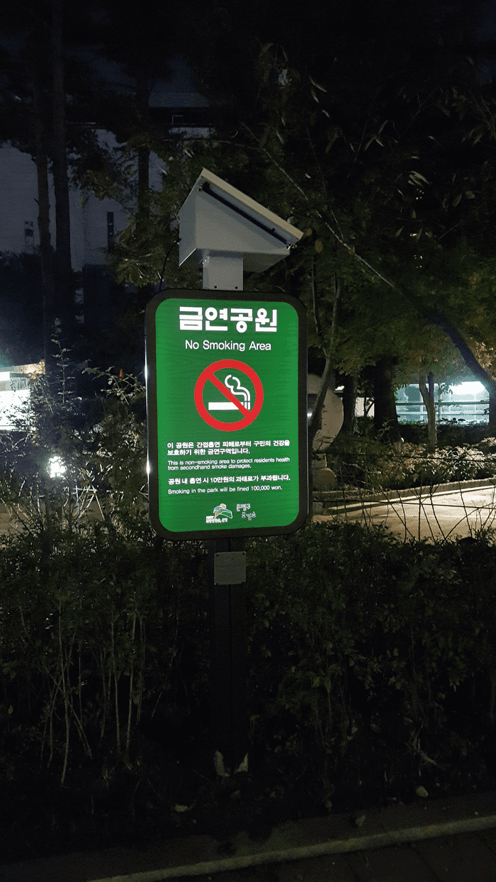 이번에 설치된 태양광 LED 금연안내 표지판은 전기 공급없이 낮 동안 햇빛으로 충전한 에너지를 이용해 밤시간에 금연 구역을 알리는 친환경 방식으로 구동된다.