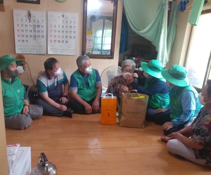 경기 양평군 지평면 새마을회는 지난 18일 홀몸노인 2가구를 방문해 달걀·두부·닭고기 등 식료품 꾸러미를 전달했다. 사진은 이날 봉사자들과 면 관계자가 대상 가구를 찾아 대화를 나누고 있는 모습. (사진제공=양평군청)