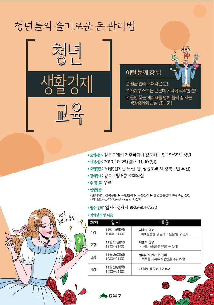 [시민일보 = 홍덕표 기자] 서울 강북구(구청장 박겸수)는 오는 19~28일 자산관리에 지식이 필요한 지역내 청년을 대상으로 생활경제교육을 한다고 밝혔다.