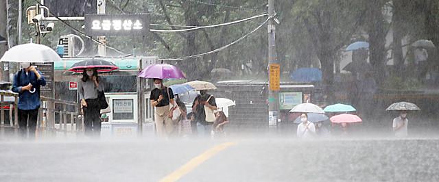 장맛비가 쏟아진 29일 오전 서울 중구 숭례문 인근에서 우산을 쓴 시민들이 발걸음을 재촉하고 있다.