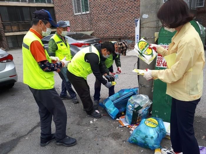 경기 양주시 회천2동은 최근 그린뉴딜 동정 시책사업 ‘깨끗한 회천2동 만들기’의 일환으로 쓰레기 불법투기 근절을 위해 상습 투기지역을 중심으로 쓰레기 무단투기 집중단속을 실시했다. 사진은 참여자들이 쓰레기 봉투에 불법 배출 스티커를 부착하고 있는 모습. (사진제공=양주시청)