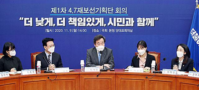 더불어민주당 이낙연 대표가 9일 국회에서 열린 제1차 4.7재보선기획단 회의에서 발언하고 있다.