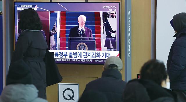 21일 서울역에서 시민들이 조 바이든 미국 대통령 취임 관련 뉴스를 보고 있다.