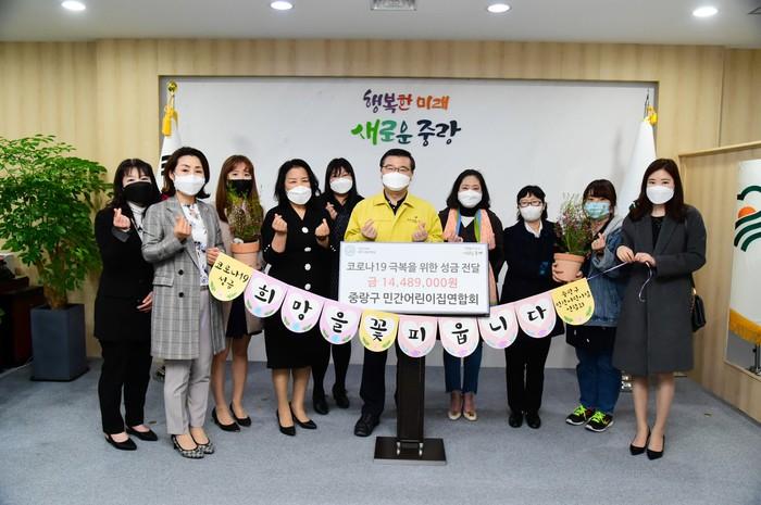 서울 중랑구는 최근 중랑구 어린이집연합회(민간어린이집연합회·국공립어린이집연합회·가정어린이집연합회)로부터 코로나19 극복을 위한 성품과 성금을 전달받았다. 사진은 전달식에 참석한 류경기 구청장(가운데)이 민간어린이집연합회 임원 등 10명과 기념촬영을 하는 모습. (사진제공=중랑구청)