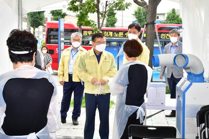 중랑구가 최근 수도권 확진자 급증에 따라 12일부터 망우역 1번 출구 앞 광장에서 코로나19 임시선별검사소 운영을 시작했다. 검사소는 평일 오전 9시~오후 5시, 주말과 공휴일에는 오전 9시~오후 1시 운영한다. 사진은 12일 류경기 구청장(가운데)이 망우역 광장 임시선별검사소를 찾아 직원들을 격려하고 있는 모습. (사진제공=중랑구청)