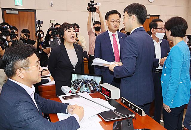 29일 국회 법제사법위원회 전체회의에서 여야 간사들이 모여 논쟁하고 있다.