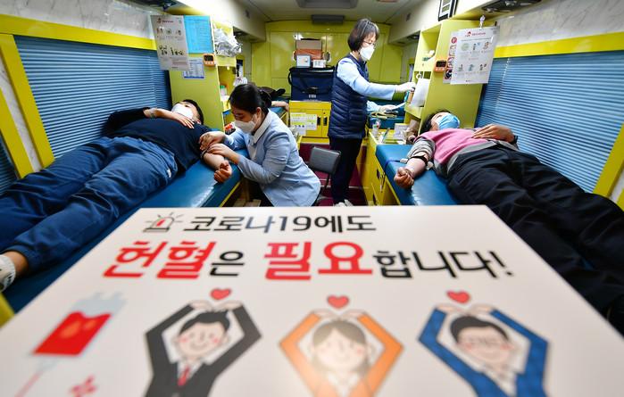 코로나19 영향으로 혈액 수급에 어려움이 계속되고 있는 28일 오전 경기 수원시 더함파크에서 수원도시공사 직원들이 헌혈하고 있다.