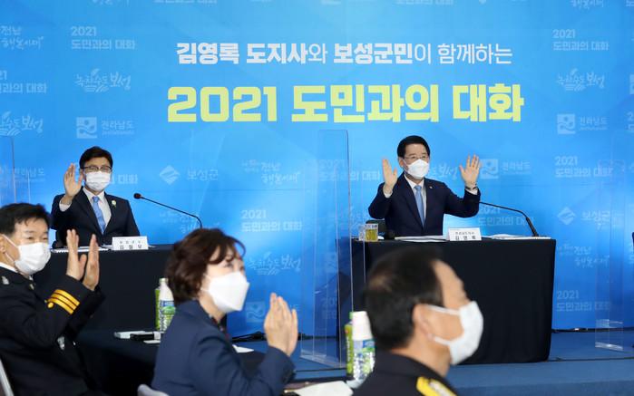 전남 보성군이 8일 군청 대회의실에서 '김영록 전남도지사와 보성군민이 함께하는 도민과의 대화'를 개최했다. 이날 행사는 코로나19 확산 방지를 위해 기존 현지 주민 초청방식에서 벗어나 최소인원이 참여한 온라인 영상대화로 진행됐다. 사진은 김철우 군수와 김영록 도지사가 행사에 참여하고 있는 모습. (사진제공=보성군청)