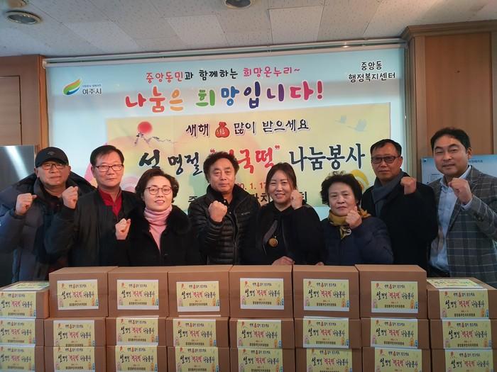 경기 여주시 중앙동 주민자치위원회는 어려운 형편으로 인해 설 명절을 반갑게 맞이하지 못하는 지역내 이웃을 위해 떡국떡(3kg) 64상자를 중앙동 행정복지센터에 기탁했다. 사진은 위원들이 떡국떡을 전달한 후 함께 기념촬영을 하는 모습. (사진제공=여주시청)