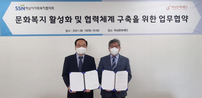 경기 하남문화재단과 하남시사회복지협의회는 19일 문화복지 활성화 및 복지 협력체계 구축을 위한 업무협약을 체결했다. 협약은 지역의 문화예술 발전과 문화복지 활성화를 위한 지속적인 교류 등 내용을 담았다. 사진은 협약식에서 관계자들이 기념촬영을 하는 모습. (사진제공=하남시청)