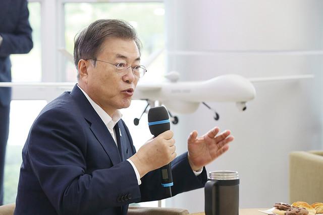 문재인 대통령이 23일 대전 유성에 위치한 국방과학연구소에서 첨단 무기와 군사장비를 시찰한 뒤 연구진과 격려간담회를 하고 있다. 국방과학연구소는 올해로 창설 50주년(8월6일)을 맞는다.
