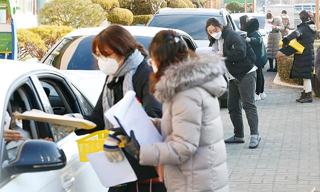 대구·경북지역 공립초등학교 신입생 예비소집이 시작된 4일 경북 경산시 정평초등학교에서 드라이브스루 방식으로 선생님들이 아이들을 만나고 있다.