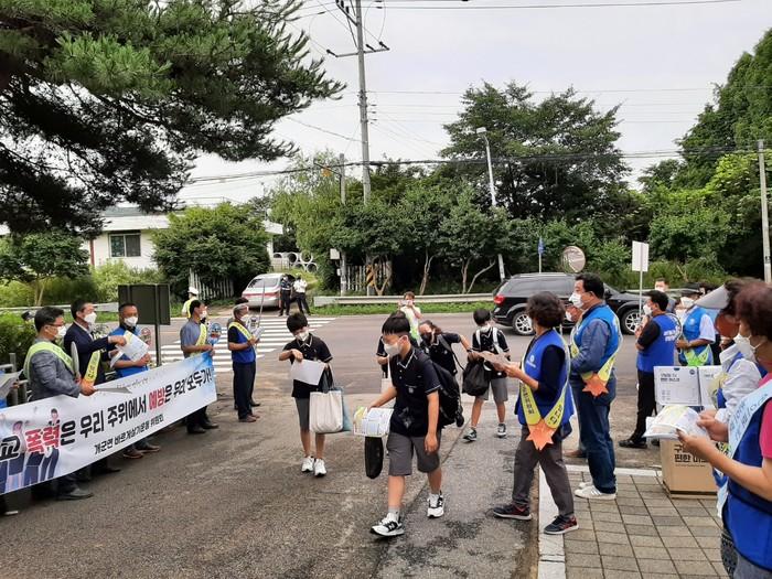 경기 양평군 개군면 바르게살기운동위원회는 5일 개군중학교 앞에서 안전한 면학 분위기 조성을 위해 학교폭력예방 캠페인을 벌이고 더불어 코로나19 확산 방지를 위해 마스크 나눔행사를 진행했다. 사진은 이날 봉사자들이 학교폭력 방지 현수막 및 피켓을 들고 캠페인 진행하고 있는 모습. (사진제공=양평군청)