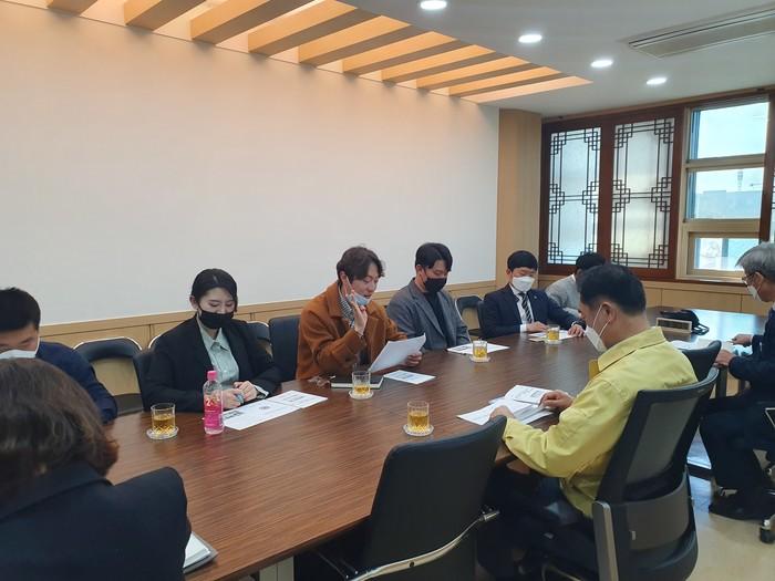 정장선 경기 평택시장이 지난 8일 시청에서 청년농업인들로 구성된 4-H연합회 청년들과 간담회를 했다. 이날 간담회에서는 청년들이 현장에서 겪는 영농 애로사항에 대한 의견을 나눴다. 사진은 정 시장과 청년들이 이야기를 나누는 모습. (사진제공=평택시청)