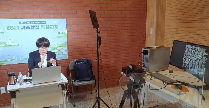 | ▲ 2050 탄소중립 실현을 위해 최근 온라인으로 진행된 2021 서대문구 기후환경 직원교육에서 전문가가 강의를 하고 있는 모습. (사진제공=서대문구청) |