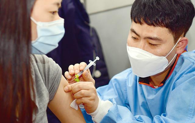 3일 오전 광주 동구 조선대학교병원 의성관에 설치된 신종 코로나바이러스 감염증(코로나19) 호남권역 예방접종센터에서 코로나19 치료 전담 의료진이 화이자 백신 주사액을 맞고 있다.