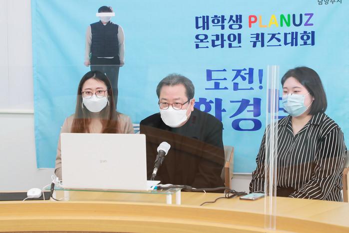 경기 남양주시가 지난 6일 비대면 화상회의 프로그램(ZOOM)을 이용해 ‘대학생 플래너즈’ 단원들의 환경의식 강화를 위한 환경 퀴즈대회 ‘도전! 환경벨’을 개최했다. 이 행사는 환경 파괴 문제와 이를 해결할 수 있는 우리의 노력에 대해 알리고자 기획됐다. 사진은 행사에 참석한 조광한 시장(가운데)이 직접 문제를 출제하고 있는 모습. (사진제공=남양주시청)