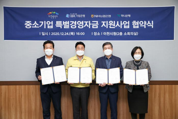 경기 이천시는 코로나19로 경영애로를 겪고 있는 지역내 중소기업을 위해 오는 2021년부터 특별경영자금을 대폭 확대하며, 최근 기업·농협·하나은행과 '중소기업 특별경영자금 지원사업 협약식'을 개최했다. 사진은 협약식에서 엄태준 시장(왼쪽 두 번째)이 은행 관계자들과 기념촬영을 하는 모습. (사진제공=이천시청)