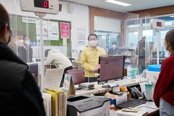 오세현 충남 아산시장이 신축년 새해를 맞아 11~16일 지역내 17개 읍·면·동 행정복지센터를 방문하며 지난해 코로나19 방역활동과 긴급생활안정자금 지원사업 신청 접수 등 최일선에서 어느 때보다 수고가 많았던 직원들의 노고를 격려한다. 사진은 오 시장이 직원들을 격려하는 모습. (사진제공=아산시청)