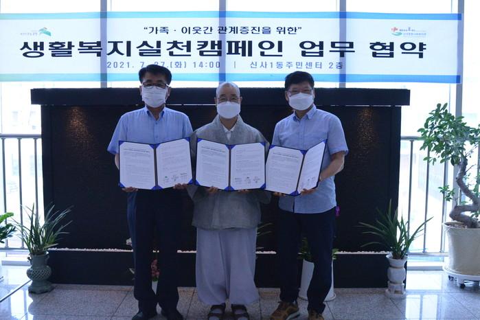 서울 은평구 신사1동 주민센터는 최근 신사1동지역사회보장협의체와 신사종합사회복지관이 ‘생활복지실천캠페인’의 업무협약을 체결했다. 생활복지실천캠페인은 가족과 이웃 간 관계 증진을 도모하고 복지공동체 기반을 마련하고자 기획했다. 사진은 협약식에서 관계자들이 기념촬영을 하는 모습. (사진제공=은평구청)