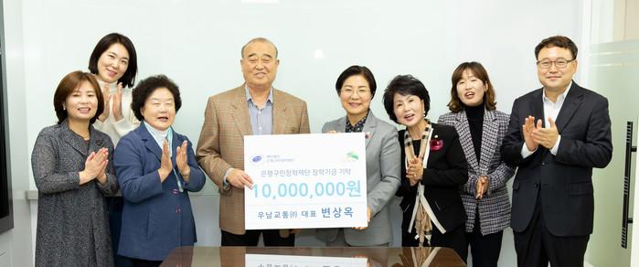 최근 서울 은평구민장학재단이 우남교통(주)으로부터 지역내 학생을 위한 1000만원을 기탁받았다. 사진은 기탁 후 기념촬영을 하고 있는 변상옥 우남교통 대표와 김미경 구청장, 관계자들의 모습. (사진제공=은평구청)