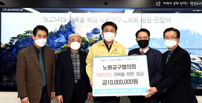 서울 노원구는 10일 구청장실에서 노원교구협의회로부터 코로나19 극복을 위한 성금 1000만원을 기탁받았다. 협의회 회원들은 '구민들에게 보탬이 되고자 한다'며 성금을 전달했다. 사진은 오승록 구청장(가운데)과 회원들이 기념촬영을 하는 모습. (사진제공=노원구청)