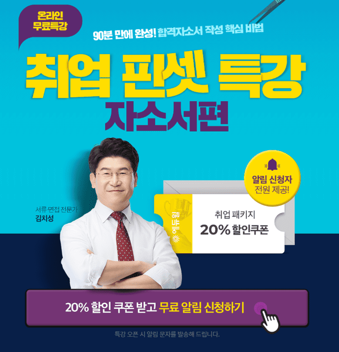 ‘취업 핀셋 특강’의 무료 알림을 신청하면 특강 오픈시 알림 문자를 발송해주며, 알림 신청자 전원에게는 취업 패키지 20% 할인쿠폰이 제공된다.
