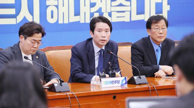 더불어민주당 이인영 원내대표가 26일 오후 서울 여의도 국회에서 기자들과 만나 긴급재난지원금 관련 질문에 답하고 있다. /연합뉴스