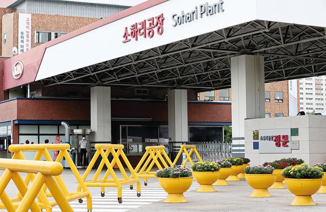 17일 오전 근무 직원 중 코로나19 확진자가 발생해 가동이 중단된 경기 광명시 기아자동차 소하리공장의 모습. 경기도 보건당국은 이날 기아차 소하리공장 관련 코로나19 확진자가 총 10명이라고 밝혔다.
