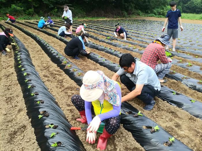 경기 오산시 남촌동 통장단협의회는 22일 통장단협의회원 등 관계자 40여명이 참여한 가운데 화성시 정남면 고지리에 위치한 밭에서 올겨울 '사랑의 김장김치 담그기 행사'에 사용할 배추 심기 작업을 실시했다. 사진은 참여자들이 배추를 심고 있는 모습.(사진제공=오산시청)