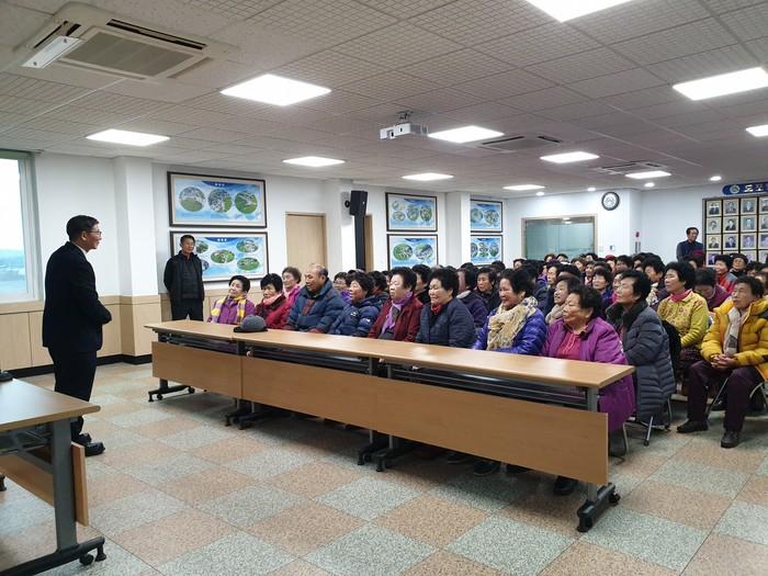 전남 영암군 도포면이 최근 면사무소 2층 회의실에서 올해 노인일자리사업 참여 노인을 대상으로 안전교육을 했다. 이날 교육에서는 근무 수칙을 비롯해 활동시 유의사항, 소화기 사용법, 전동차 및 성인유모차 운행 주의사항 등을 설명했다. 사진은 교육이 진행 중인 모습. (사진제공=영암군청)