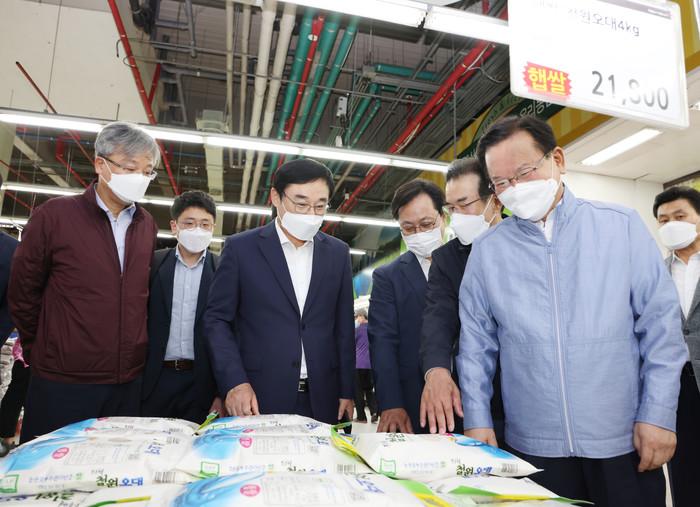 이동진 서울 도봉구청장이 지난 8일 창동 농협 하나로마트를 찾은 김부겸 국무총리와 함께 추석 민생현장을 살폈다. 사진은 이날 이 구청장(가운데)이 김 총리와 함께 농수산물을 비롯한 성수품을 둘러보고 있는 모습. (사진제공=도봉구청)