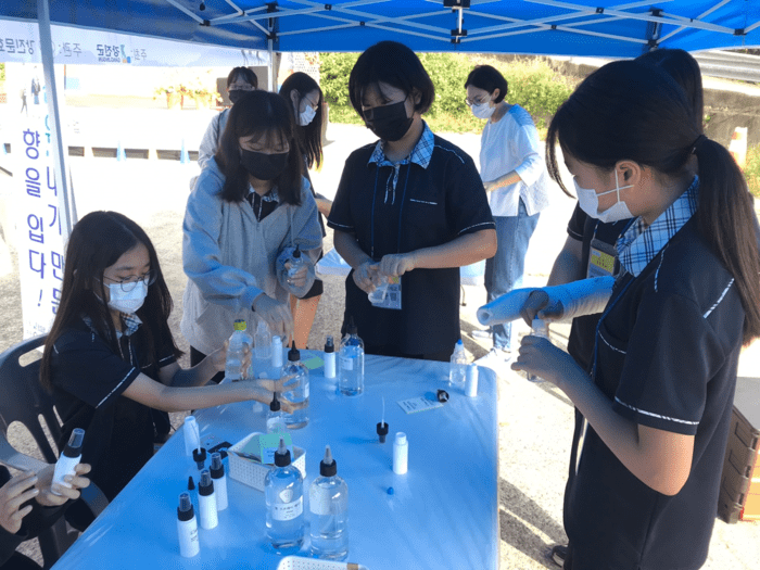 전남 강진문화원이 최근 이틀간 강진여중 1학년 학생을 대상으로 자유학년제와 연계해 ‘폼生폼士 강진향교’ 진로 프로그램을 운영했다. 여행작가 배선희씨가 SNS시대 자신에게 맞는 꿈을 찾아나가는 과정을 주제로 학생과 소통하고, 야외 행사로 다양한 체험 부스와 강향 콘서트를 함께했다. 사진은 학생들이 섬유 향수를 만들고 있는 모습. (사진제공=강진군청)