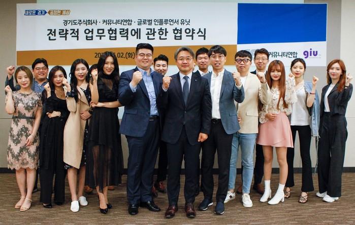 경기도주식회사가 도내 중소기업 제품의 홍보·판로개척을 위해 지난 2일 경기스타트업캠퍼스에서 커뮤니티연합, 글로벌 인플루언서 유닛(GIU)과 ‘전략적 업무협력에 관한 협약’을 체결했다. 사진은 협약 후 기념촬영을 하고 있는 관계자들의 모습. (사진제공=경기도주식회사)