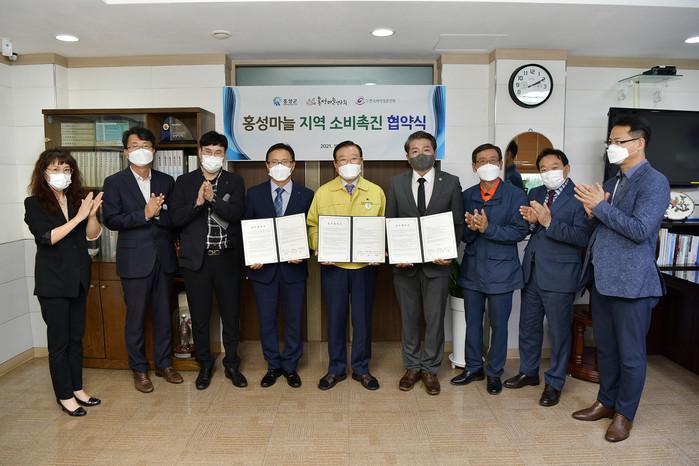 충남 홍성군은 14일 홍성마늘연구회·한국외식업중앙회와 함께 ‘홍성마늘 지역 소비 촉진 협약’을 체결했다. 협약의 주요 내용은 민·관 협업을 통한 생산 기반 조성, 브랜드 강화 등이다. 사진은 협약식에서 김석환 군수(가운데)와 관계자들이 기념촬영을 하는 모습. (사진제공=홍성군청)