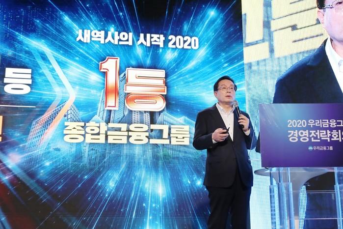 | 우리금융그룹은 최근 우리은행 본점 대강당에서 과감한 변화와 혁신으로 1등 종합금융그룹 도약을 결의하는‘2020 우리금융그룹 경영전략회의’를 개최했다.(사진제공=우리은행) |