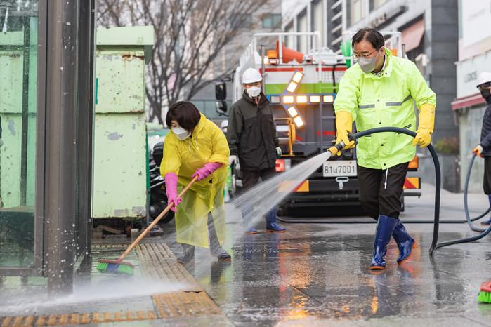 서울 광진구가 26일 지역내 주요 간선도로 및 보도, 버스정류장 주변에서 새봄을 맞아 깨끗하고 쾌적한 도시환경을 조성하고 코로나19 확산을 방지하고자 대청소를 실시했다. 사진은 군자역 일대에서 김선갑 구청장(오른쪽)이 물청소를 하는 모습. (사진제공=광진구청)