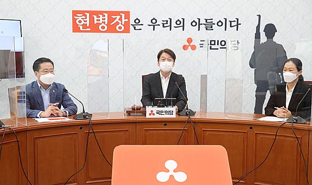 국민의당 안철수 대표가 17일 오전 서울 여의도 국회에서 열린 최고위원회의에서 발언하고 있다. 국민의당은 이날 백드롭(뒷배경)을 ‘현병장(당직사병)은 우리의 아들’이라는 문구로 교체했다.
