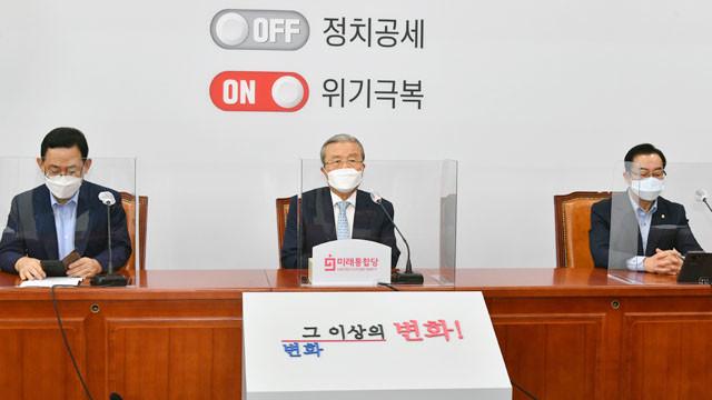 미래통합당 김종인 비상대책위원장이 31일 서울 여의도 국회에서 열린 온라인 의원총회에서 발언하고 있다. 이날 의총은 코로나19 확산으로 인해 당 공식 유튜브 채널인 ‘오른소리’를 통해 비대면으로 진행됐다.