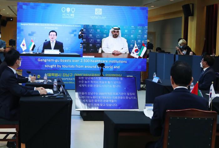 서울 강남구가 최근 한-UAE 수교 40주년을 맞아 한류관광, K-의료, 스타트업의 중동진출을 돕기 위해 아부다비상공회의소와 온라인 화상 업무협약을 체결했다. 이에따라 앞으로 양 기관은 ▲온라인 수출상담회 ▲화상상담소 ▲K-POP 스타와 함께하는 온택트 콘서트 공동제작 등을 진행한다. 사진은 업무협약 체결을 하고 있는 양 기관의 모습. (사진제공=강남구청)
