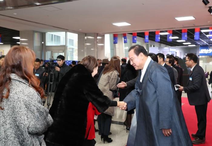 서울 마포구가 9일 구청 1층 어울림마당에서 '2020년 신년인사회'를 열고 희망찬 한 해를 다짐했다. 이날 행사에는 유동균 구청장을 비롯해 지역 주요인사와 각계각층의 구민 총 1500여명이 참석했다. 사진은 유 구청장이 구민들을 맞이하는 모습. (사진제공=마포구청)