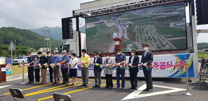 경기 이천시가 최근 신둔면 장동1리 회전교차로에서 '장동1·2리간 농어촌도로 확·포장 공사' 준공식을 개최하고 도로 전구간을 개통했다. 이 도로는 시에서 3차에 걸쳐 시행한 사업으로 시도3호선 도암리에서 장동1리를 잇는 1.56km 구간이다. 사진은 이날 준공식에 참석한 엄태준 시장(왼쪽 여덟 번째)이 관계자들과 테이프 커팅을 하는 모습. (사진제공=이천시청)